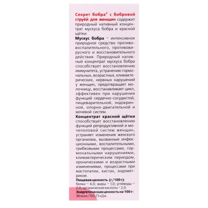 Капли «Секрет бобра»® с бобровой струёй изготовлены из живого концентрата мускуса бобра и красной щётки для здоровья, долголетия и молодости женщин. Живые природные концентраты мускуса бобра и красной щётки оказывают направленное восстанавливающее и укрепляющее действие на женский организм. Капли для женщин – интенсивное средство, предотвращающее ежедневные разрушительные процессы в организме женщины, вызванные внешними и внутренними неблагоприятными факторами: стресс, нервное напряжение, отсутствие подвижности или тяжёлая физическая нагрузка, переохлаждение, УФ-излучение, нарушение обменных процессов и лишний вес.