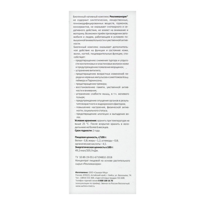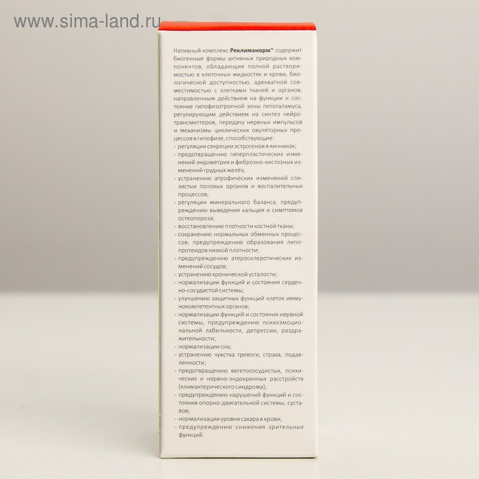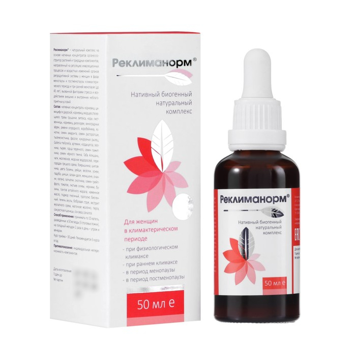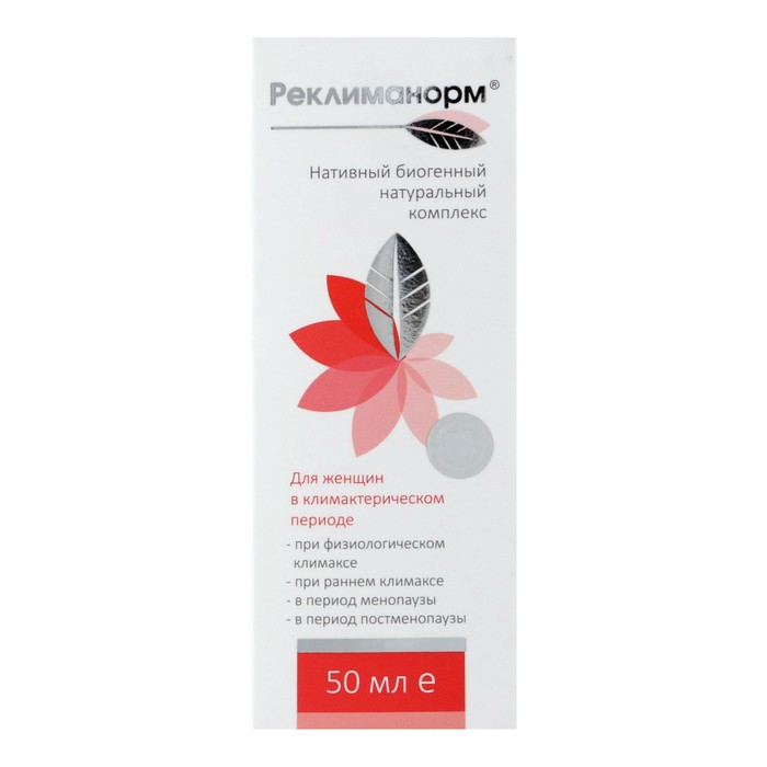 «Реклиманорм» – специально разработанная биогенная формула на основе исключительно натуральных компонентов растительного и животного происхождения, заготовленных в период их максимальной биологической активности в диких природных условиях, обладающая абсолютной совместимостью с клеточными структурами организма, рекомендованная для женщин в период менопаузы, постменопаузы, при раннем климаксе, климактерических симптомах.
