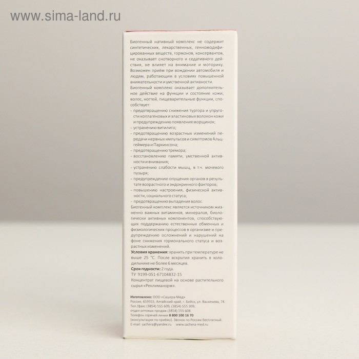 Состав: нативные концентраты корневищ цимицифуги даурской, корневищ якорцев стелющихся, травы грушанки, витекса, коры лиственницы, корневищ диоскореи, виноградных зёрен, ревеня огородного, воробейника, яснотки, семян амаранта, семян расторопши, тысячелистника, фасоли, кукурузных рылец, Galleria mellonella, артемии, кордицепса, зюзника, пырея, горца перечного, семян пажитника, семян чёрного тмина, Габа Алишань, чаги, моллюсков, морских водорослей, перегородок грецкого ореха, боярышника, шиповника, цвета бузины, рейши, весёлки, уснеи, падуба, шикши, сагаан-дали, женьшеня, очанки, лапачо, лапчатки, окопника, семян грейпфрута, томатов, листьев оливы, черники, бузины, пантов алтайского марала, каменное масло, подмор пчелиный, прополис биогенный, печень акулы, бобровая струя, экстракт мускатного ореха, маточное молочко, перга, сок ростков пшеницы, сок овса, сок алоэ.
