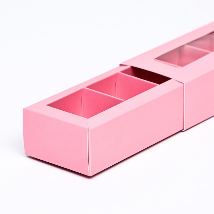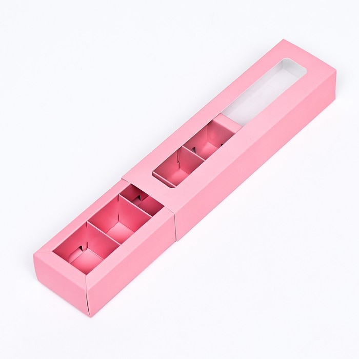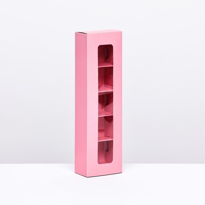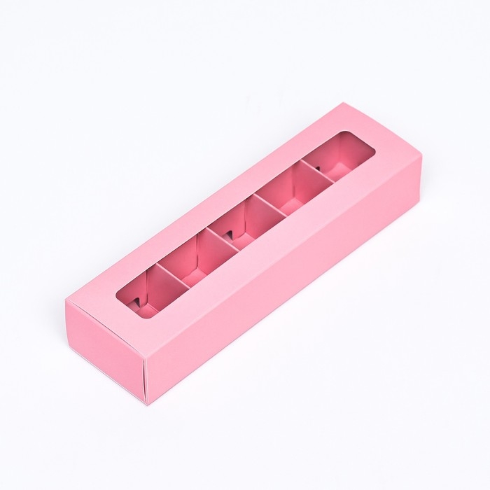 Коробка под 5 конфет с обечайкой, с окном, с тонкими разделителями, Розовая 20х5х3,3 см