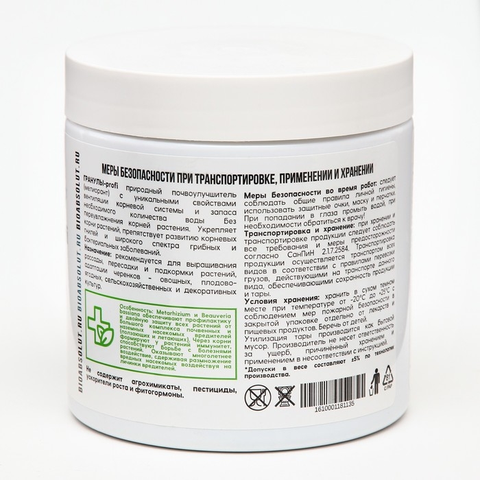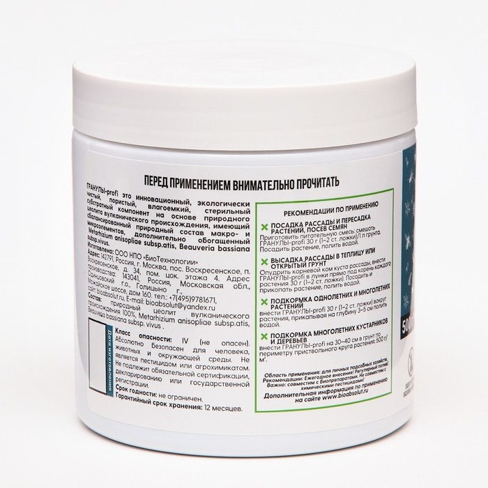 Гранулы-profi Биозащита - это инновационный, экологически чистый, пористый, влагоемкий, стерильный субстратный компонент на основе природного цеолита вулканического происхождения, имеющий сбалансированный природный состав макро- и микроэлементов, а также дополнительно обогащен спорами грибов Metarhizium anisopliae subsp.atis, Beauveria bassiana subsp.vivus.