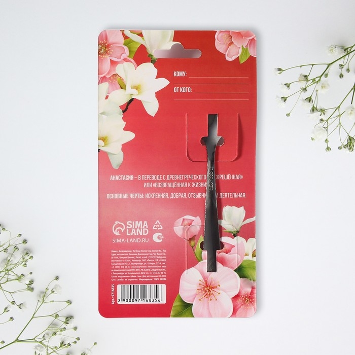 Ложка с лазерной гравировкой и изящной рукояткой преподносится на красочной открытке. На оборотной стороне изделия специально отведено место для подписи: кому и от кого был вручён подарок.