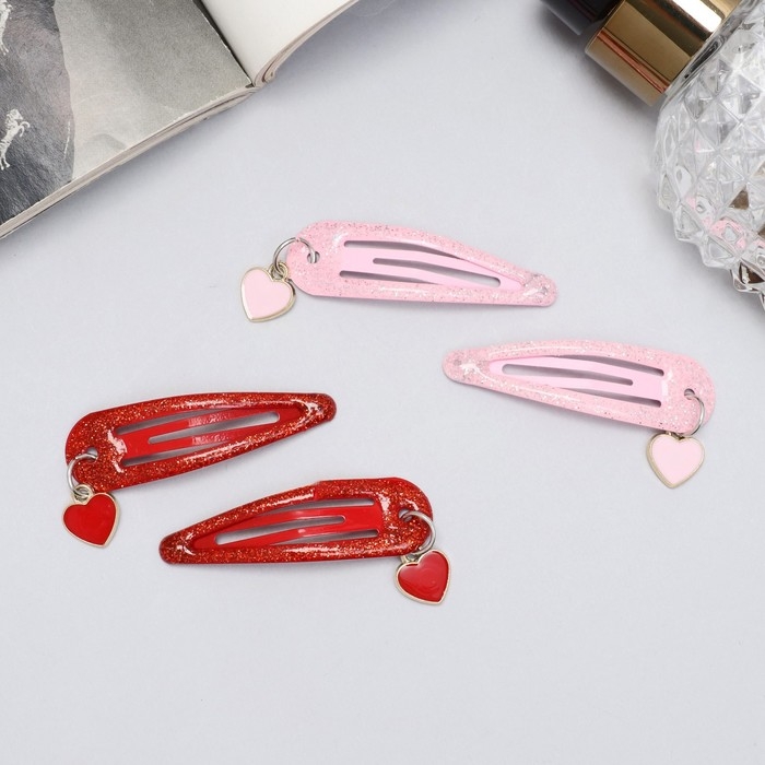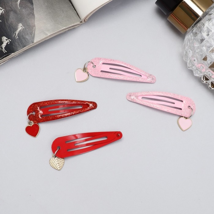 Невидимка для волос "Офелия" (набор 4 шт) сердечки, 4,5 см, красный розовый