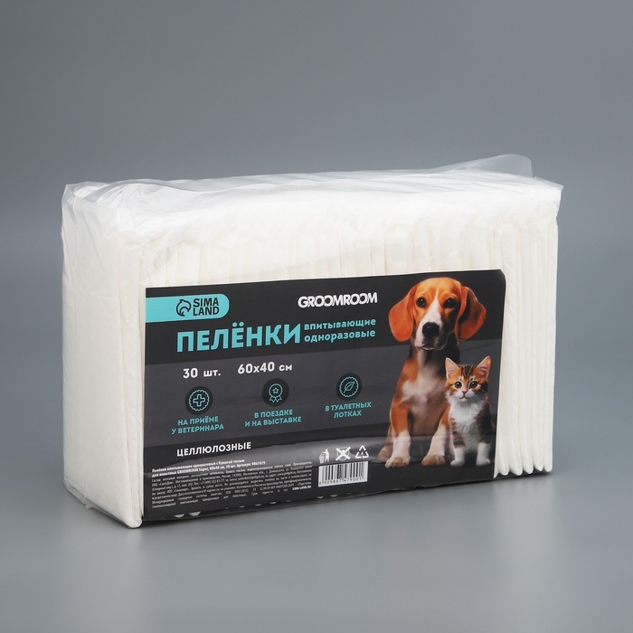 Пелёнки впитывающие целлюлозные для животных, 60 х 90 см, 30 шт