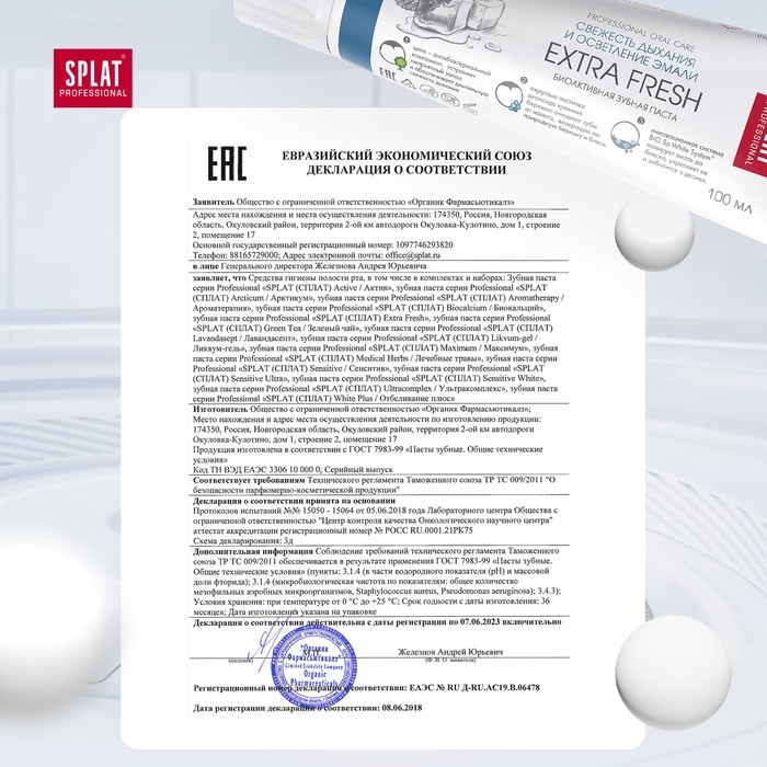 Зубная паста SPLAT Professional «Экстра Фреш» (EXTRA FRESH) интенсивно освежает дыхание и эффективно осветляет эмаль.Глюконат цинка блокирует болезнетворные бактерии – причину неприятных запахов изо рта. Диоксид кремния и фермент бромелаин бережно очищают зубы от налета, возвращая им природную белизну. Эфирные масла мяты, грейпфрута, экстракт ратании и антибактериальный компонент бисаболол защищают от кариеса и предотвращают появление налета. Экстракт бифидобактерий поддерживает здоровую микрофлору в полости рта. Рекомендуется взрослым и детям с 14 лет.