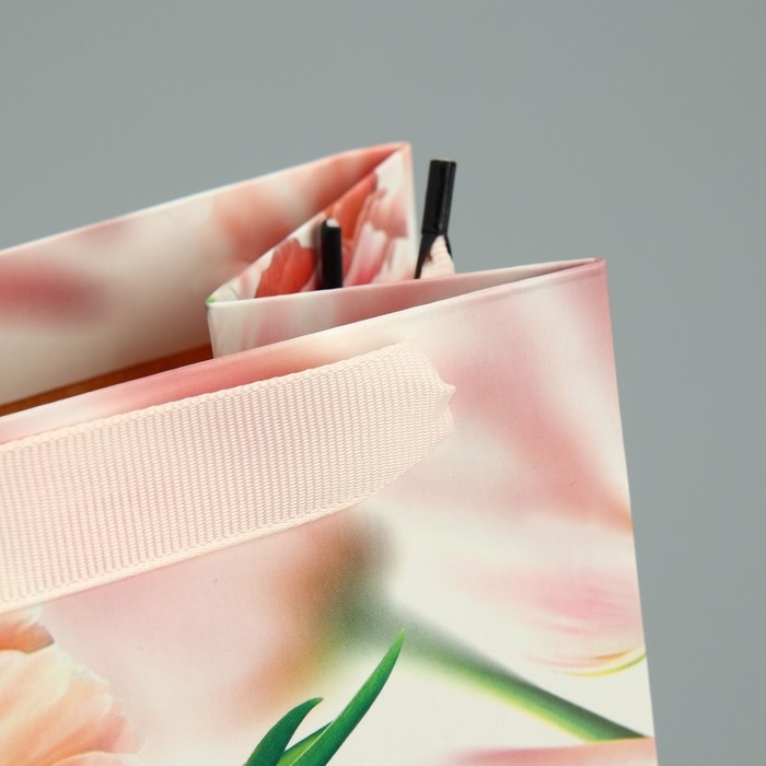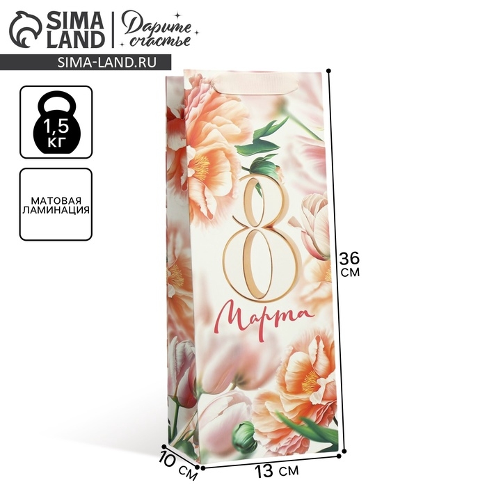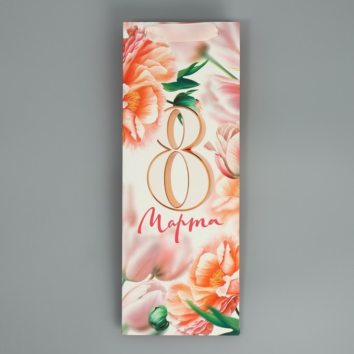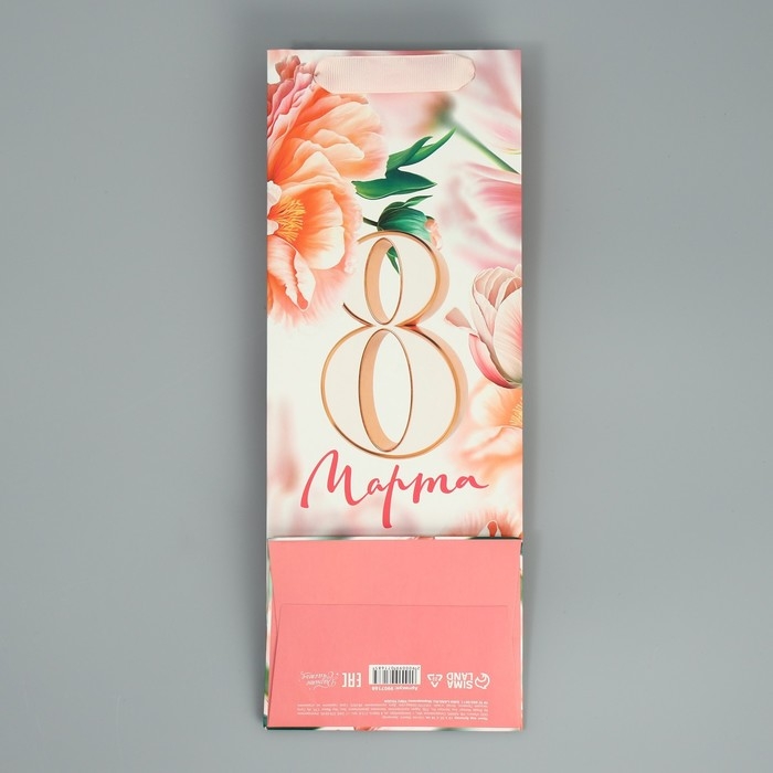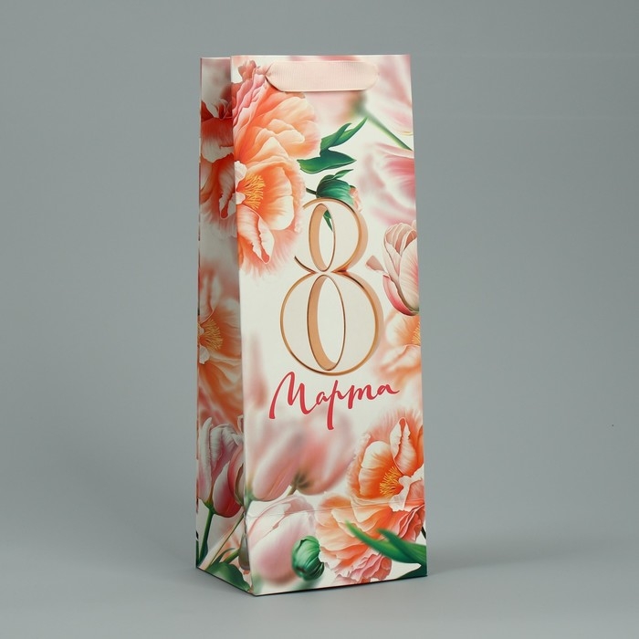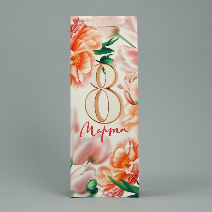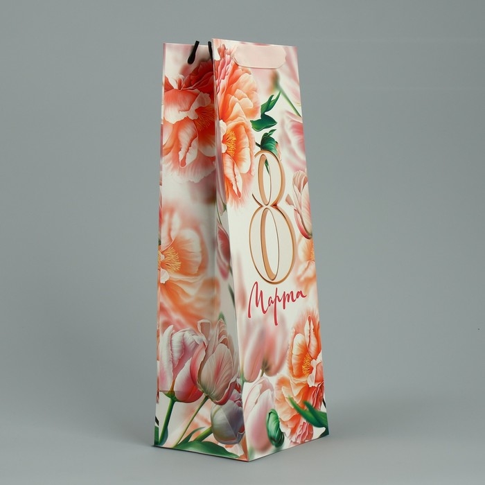 Пакет подарочный ламинированный под бутылку, упаковка, «8 марта», цветы, 13 x 36 x 10 см
