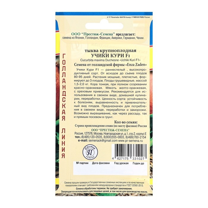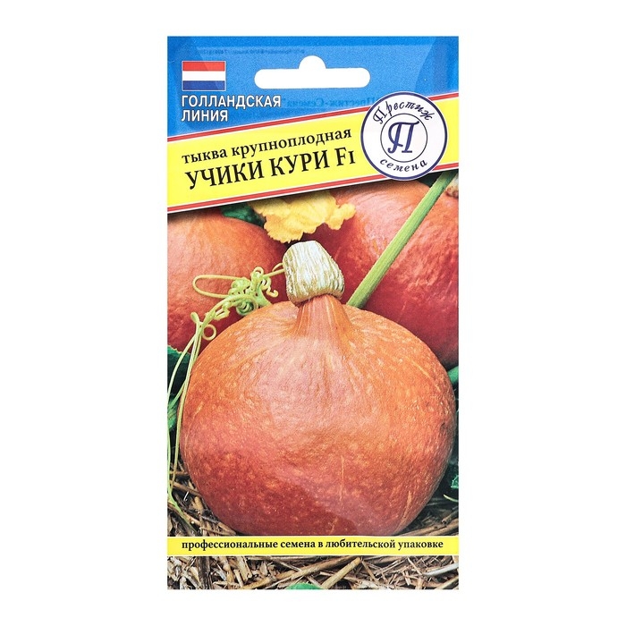 Учики Кури F1- раннеспелый , высокопродуктивный сорт. От всходов до съема плодов 80-95 дней. Растения мощные, плетистые, формируют до 3 плодов. Плоды грушевидные, массой 1,5-2,0 кг. Кора тонкая, при полном созревании красно-оранжевая. Мякоть желто-оранжевая, с ореховым привкусом. Рекомендуется для использования в свежем виде, домашней кулинарии, переработки. Ценность сорта: устойчивость к болезням, выравненность и привлекательный вид плодов. Предназначен для потребления в свежем виде , переработки и заморозки. Возможно выращивание, как через рассаду так и прямым посевом в грунт.