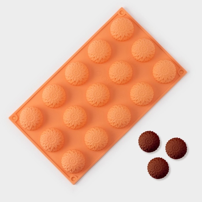 Форма для конфет и шоколада «Цветы. Хризантема», силикон, 29×17×2 см, 15 ячеек, цвет оранжевый