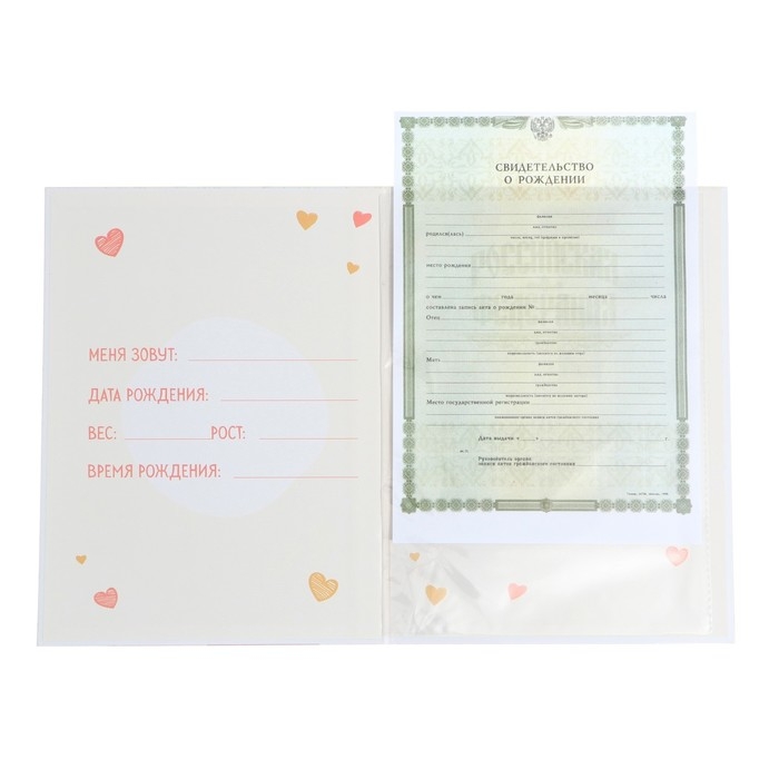 Папка под свидетельство о рождении формата А4 имеет удобный файл внутри, который защитит первый в жизни документ малыша от повреждений.