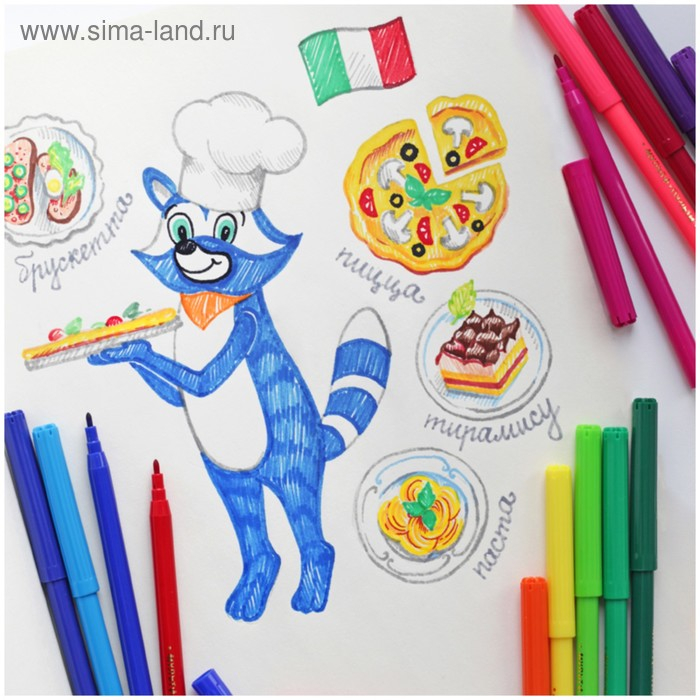 Фломастеры «Мульти-Пульти» серии «Енот в Италии» представлены с легкосмываемыми чернилами и вентилируемым колпачком. Толщина линии письма составляет 2 мм, а длина линии письма – не менее 260 метров. В наборе 36 ярких цветов. Корпус круглой формы изготовлен из полипропилена. Тип наконечника – конический. Фломастеры сохраняют стабильный цвет при письме на протяжении всего использования. Смываемые фломастеры на водной основе нетоксичны. Набор фломастеров упакован в блистер с петлёй-европодвесом.Количество цветов: 36,Тип наконечника: конический,Длина линии письма: 260 метров.