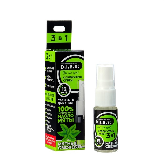 Освежитель для рта D.I.E.S. мятный 3 в 1 имеет приятный мятный вкус и аромат, который мгновенно освежает дыхание. Он подходит для использования в любое время дня и обеспечивает длительный эффект освежения и защиты от кариеса.