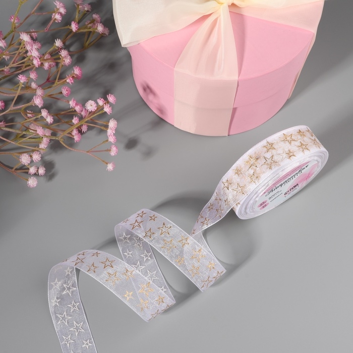 Лента капроновая с тиснением «Звёзды», 25 мм, 23 ± 1 м, цвет белый/золотой