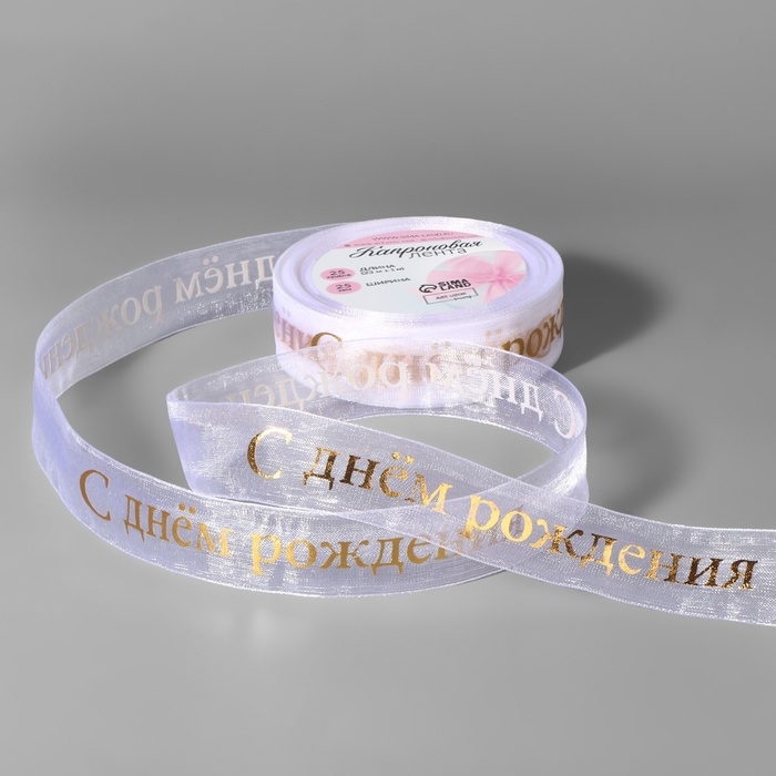 Лента капроновая с тиснением «С Днём рождения», 25 мм, 22 ± 1 м, цвет белый/золотой