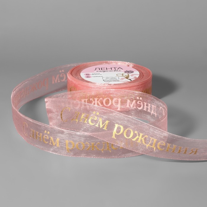 Лента капроновая с тиснением «С Днём рождения», 25 мм, 22 ± 1 м, цвет розовый/золотой