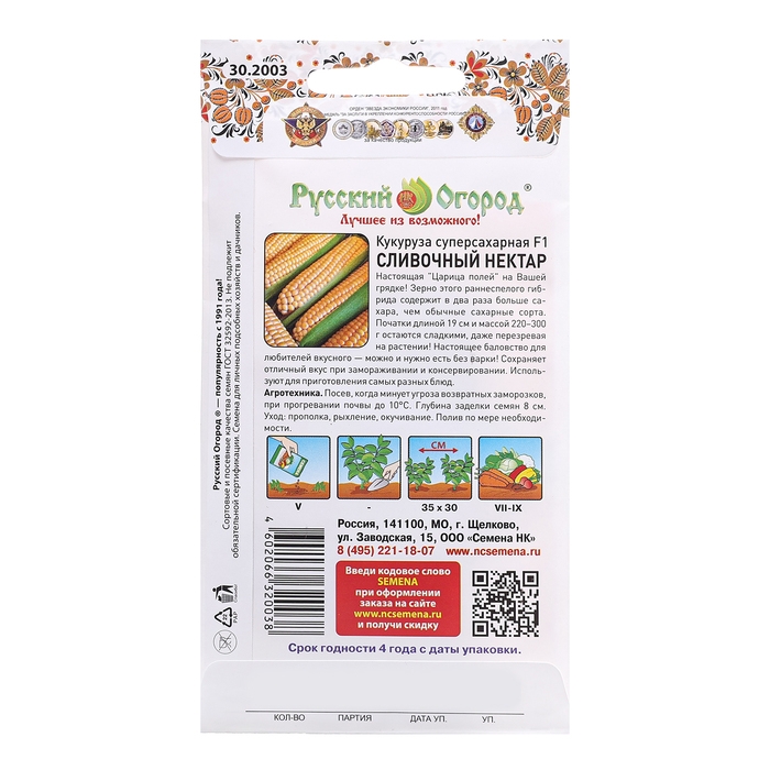 Зерно этого раннеспелого гибрида содержит в два раза больше сахара, чем обычные сахарные сорта. Початки длиной 19 см и массой 220-300 г остаются сладкими, даже перезревая на растении! Настоящее баловство для любителей вкусного — можно и нужно есть без варки! Сохраняет отличный вкус при замораживании и консервировании. Используют для приготовления самых разных блюд. Условия выращивания. Посев, когда минует угроза возвратных заморозков, при прогревании почвы до 10°С. Глубина заделки семян 8 см. Уход: прополка, рыхление, окучивание. Полив по мере необходимости.