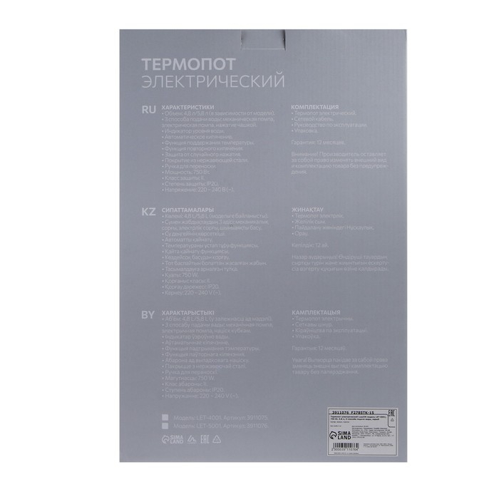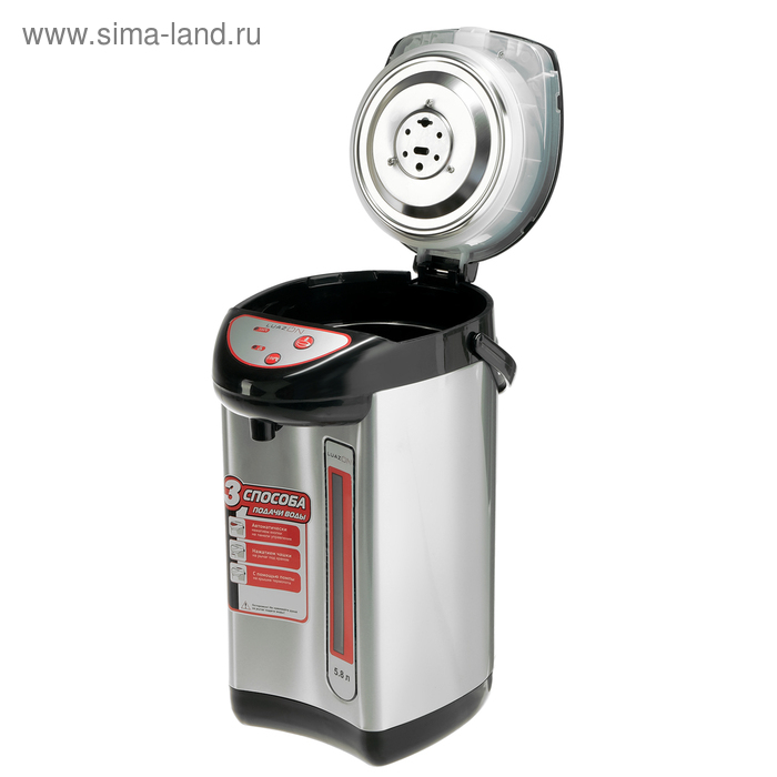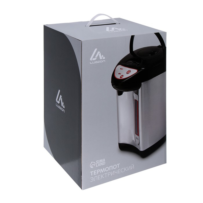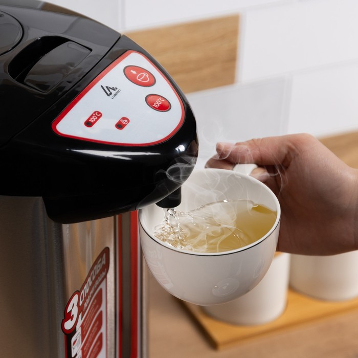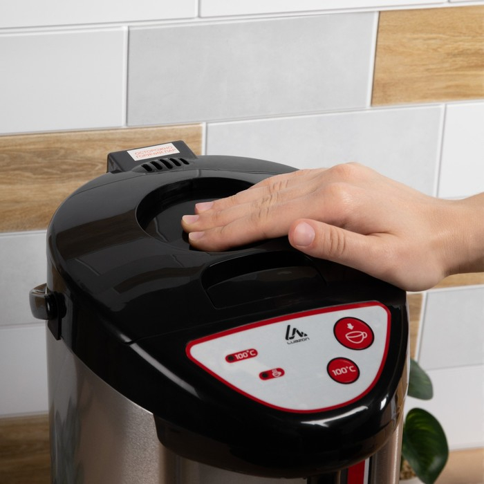 Термопот LuazON LET-5001 предназначен для кипячения воды и поддержания её температуры. Имеет 3 способа подачи воды: механическая помпа, электрическая помпа и нажатие кружкой. Оснащён индикатором уровня воды и защитой от случайного нажатия.