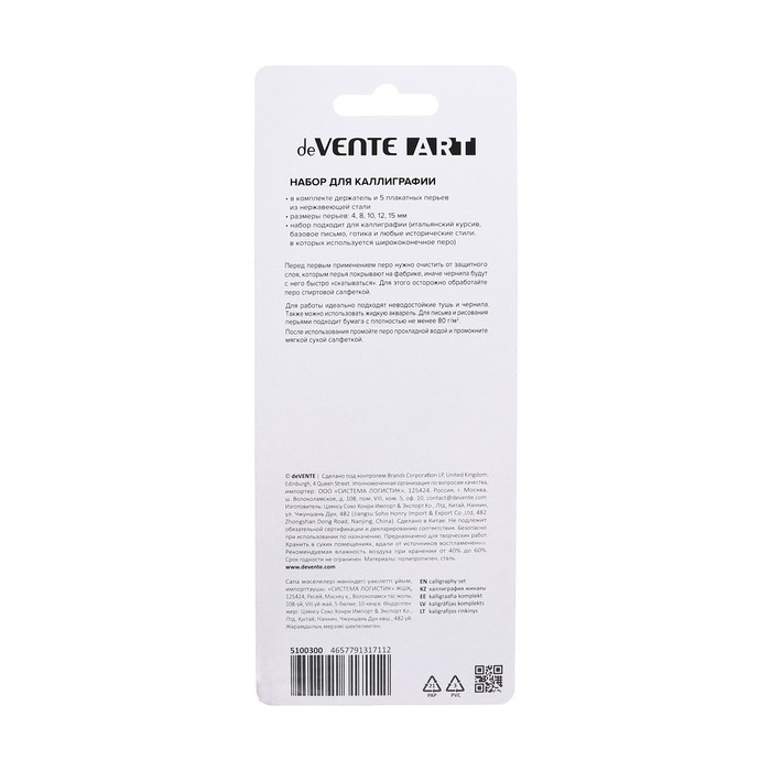 Набор плакатных (постерных) ширококонечных перьев с держателем идеально подходит для оформительских работ, написания текстов крупным шрифтом и рисования. В наборе 5 стальных перьев разных размеров: 4, 8, 10, 12. 15. Толщина линии письма – 4-15 мм. Перья позволяют наносить линии разной толщины и нажима. В наборе удобный чёрный пластиковый эргономичный держатель с soft-touch-покрытием. Набор упакован в блистер.