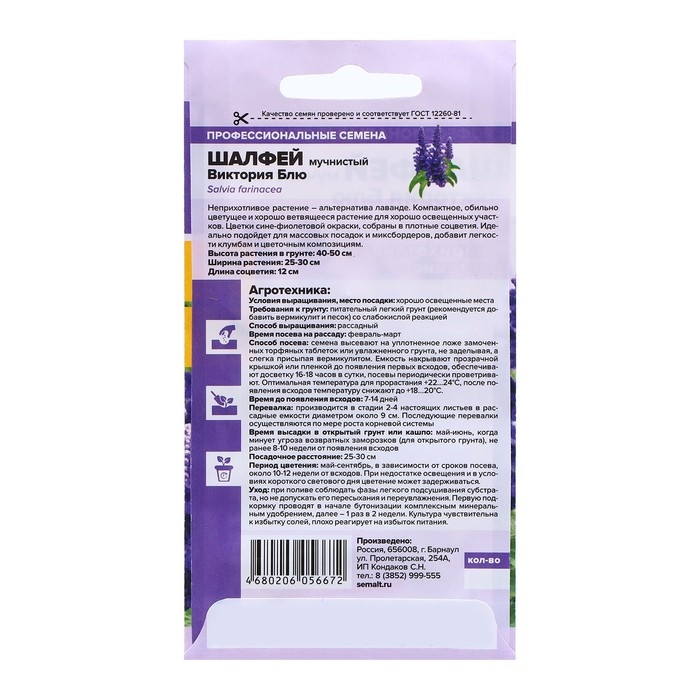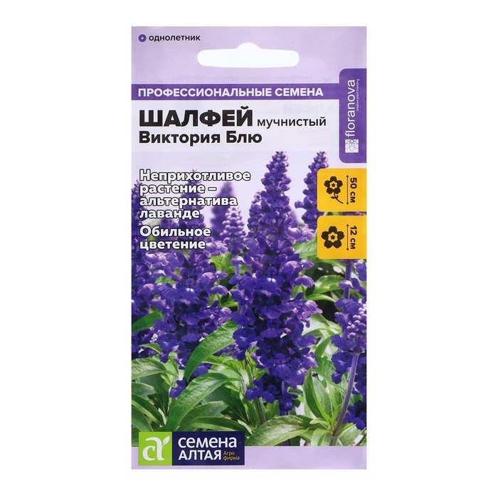 Шалфей Виктория Блю мучнистый (Семена Алтая) Виктория Блю - удивительно красивый сорт шалфея, ценящийся садоводами за роскошную темно-синюю расцветку цветочных колосьев. Это превосходная альтернатива лаванде с пышным, обильным цветением и исключительной нетребовательностью в уходе. Очаровательные фиолетово-синие соцветия безукоризненно смотрятся на клумбах, рабатках и цветочных бордюрах. Декоративные особенности Мучнистый шалфей Виктория Блю - это многолетнее травянистое растение, формирующее компактные и аккуратные хорошо ветвящиеся кусты высотой до 50 см. Его крепкие и упругие стебли покрыты белесым мучнистым налетом, напоминающим муку, что и дало название виду. Диаметр пышной и густой кроны достигает 30 см. Листья шалфея Виктория Блю продолговатые, зазубренные, с блестящей поверхностью и серебристо-серым оттенком с нижней стороны. Цветки мелкие, собранные в плотные соцветия цилиндрической формы длиной до 10-12 см. Они имеют насыщенную фиолетово-синюю окраску. Цветение шалфея длится практически весь сезон - с мая до сентября. В ландшафтном дизайне Виктория Блю открывает множество возможностей для использования в ландшафтном дизайне. Изумительные фиолетово-синие соцветия используются в цветочных аранжировках, идеально подходят для украшения балконов, внутренних двориков и террас. Шалфей Виктория Блю используется в оформлении рабаток, миксбордеров и бордюр. Многолетник с красочными соцветиями можно высаживать группами, комбинировать с другими садовыми культурами или использовать в качестве солитера, придающего особую элегантность и утонченность любой клумбе. Условия для выращивания Шалфей мучнистый Виктория Блю - неприхотливое растение которое можно высаживать на хорошо освещенном участке или в легкой полутени. Лучше всего многолетник растет на рыхлом нейтральном грунте, обогащенном органикой. Семена для получения рассады можно высеивать в феврале или марте. Для этого используют емкости с питательной, увлажненной почвой или торфяные таблетки. Посевы присыпают тонким слоем вермикулита и оставляют под пленкой до прорастания. После появления 1-2 пар первых настоящих листочков сеянцы переваливают в индивидуальные емкости диаметром 8-10 см. В мае-июне подросшую рассаду переносят на постоянное место. Для пышного цветения шалфея нужен минимальный уход - умеренные поливы, подкормки комплексными минеральными удобрениями 2 раза в месяц, рыхления почвы вокруг кустов.