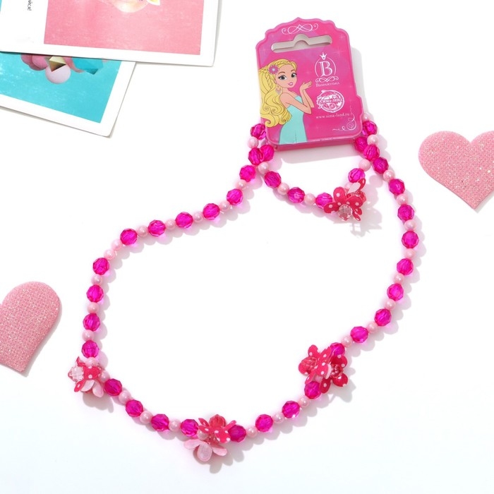 Набор детский «Выбражулька» 2 предмета: бусы, браслет, цветы пушистые, цвет розовый
