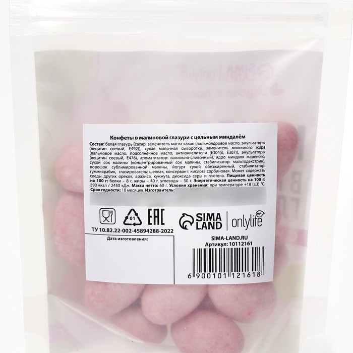 Состав: белая шоколадная глазурь (сахар, какао-масла эквивалент (смесь растительных масел), молоко сухое обезжиренное, какао-масло, сыворотка сухая молочная, эмульгаторы (лецитин соевый, Е476), ароматизаторы), ядро миндаля жареного, порошок сублимированной малины, малина сушёная, йогурт сухой обезжиренный, стабилизатор – гуммиарабик, краситель пищевой натуральный – кармин, глазирователь – шеллак, регулятор кислотности – лимонная кислота.