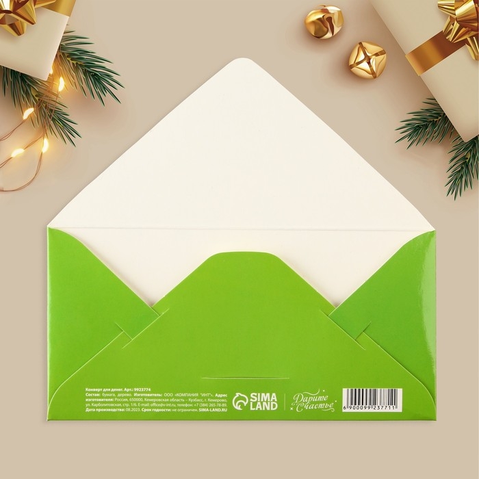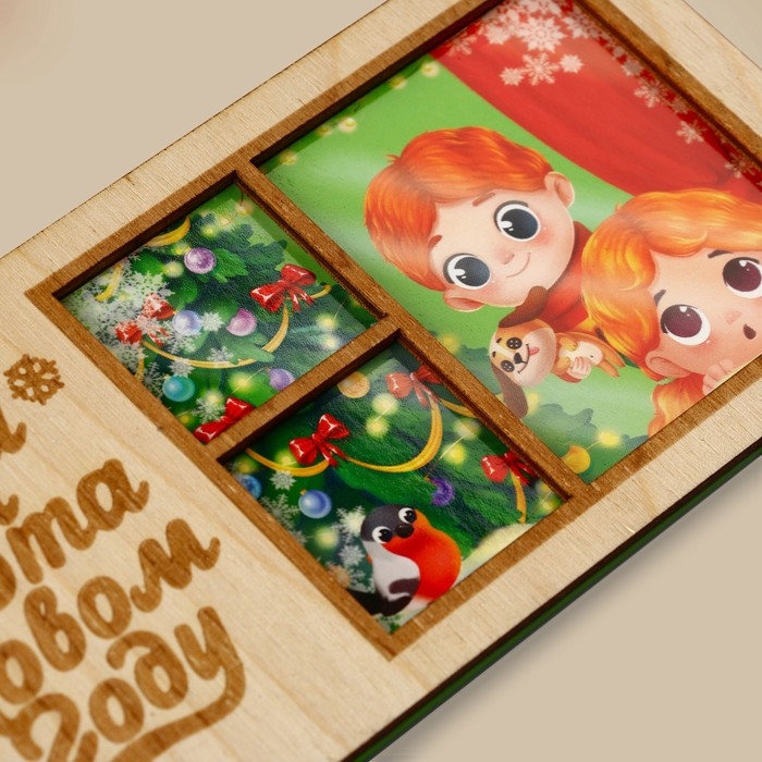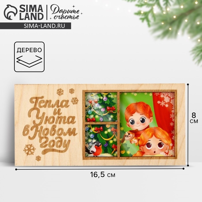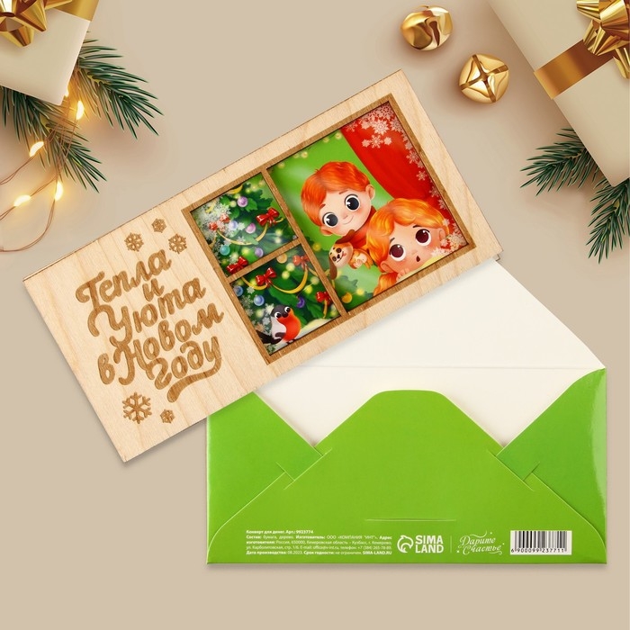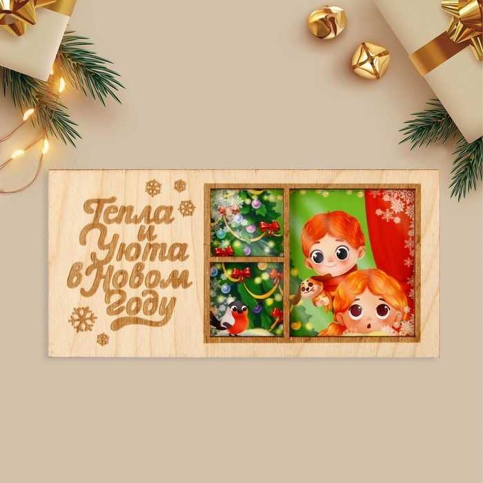 Конверт для денег деревянный резной «Тепла и Уюта в Новом году», ёлка в окне, 16.5 х 8 см, Новый год