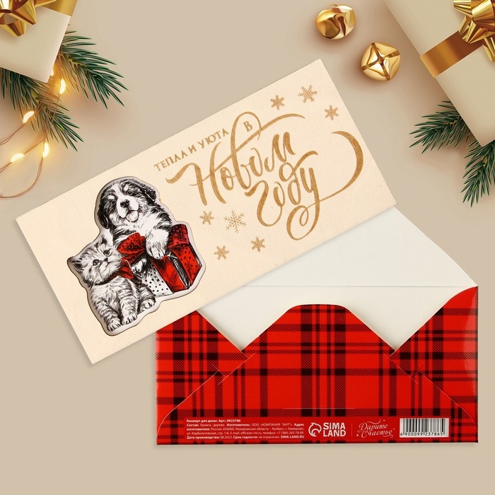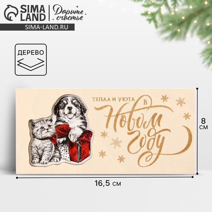 Конверт для денег деревянный резной «Тепла и уюта», щенок и котёнок, 16.5 х 8 см, Новый год