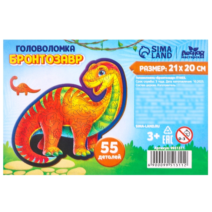 Пазл деревянный фигурный «Бронтозавр», 55 элементов