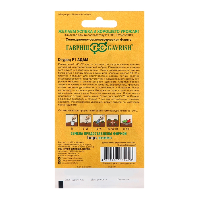 Огурец Адам F1 - это раннеспелый (45-52 дня от всходов до плодоношения) высокоурожайный гибрид с высокой устойчивостью к неблагоприятным факторам внешней среды. Рекомендован для открытого грунта и пленочных теплиц. Плоды цилиндрические, мелкобугорчатые с легким белым опушением, зеленые, массой 90-95 г. Отлично подойдут для приготовления свежих летних салатов и консервирования. Устойчив к кладоспориозу, вирусу огуречной мозаики и мучнистой росе. Ценность огурца Адам F1: превосходные вкусовые и засолочные качества, выравненные, красивые плоды, высокая урожайность и устойчивость к болезням. Урожайность — 8,2-10,2 кг/кв.м. Посадка огурца Адам F1: на рассаду высевают в конце апреля. Высадка рассады в грунт в конце мая – начале июня в фазе 3-4-х настоящих листьев. Посев непосредственно в грунт – в мае – июне. Схема посадки 30х70 см.