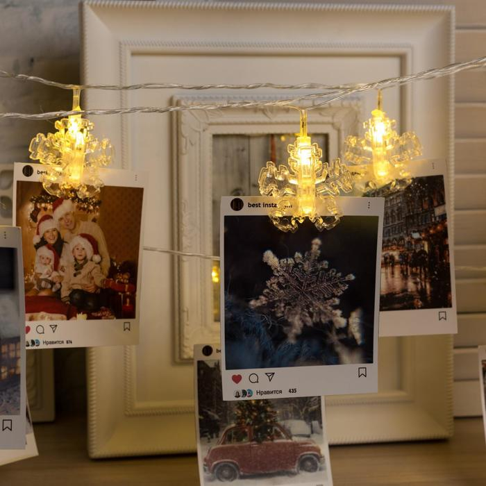 Гирлянда «Нить» 4.5 м с насадками «Прищепки-снежинки», IP20, прозрачная нить, 20 LED, свечение тёплое белое, 220 В