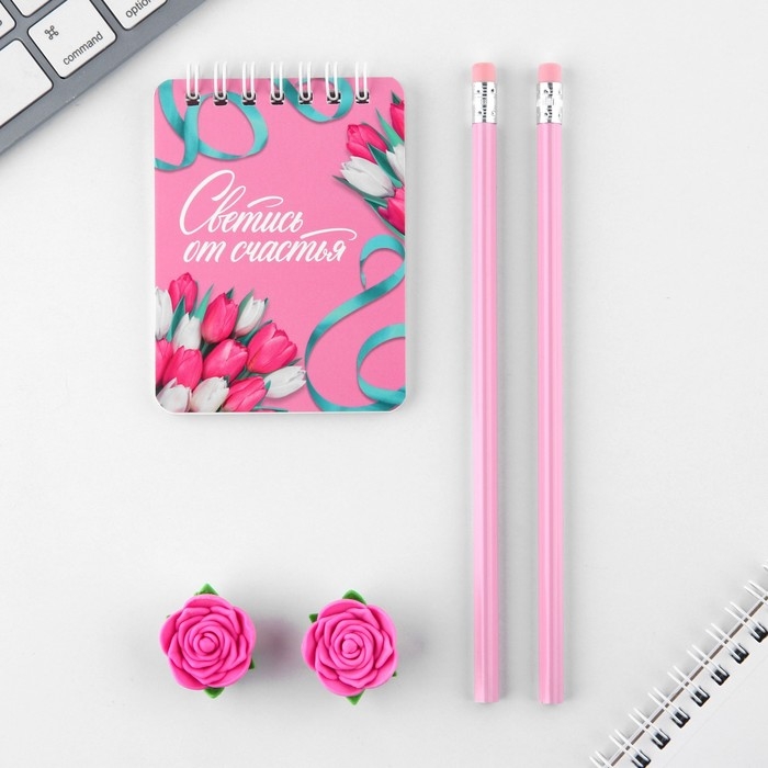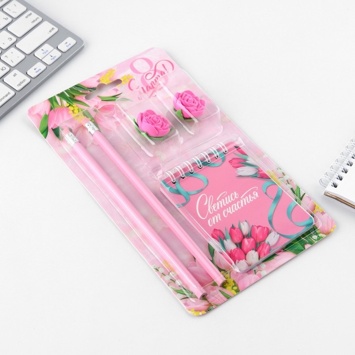 Подарочный набор «С 8 марта», карандаши 2 шт, ластики 2 шт, блокнот
