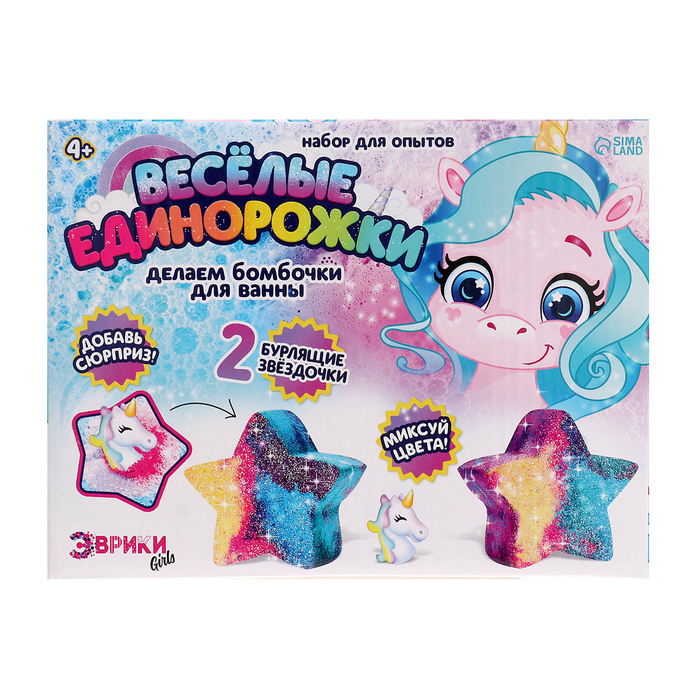 С набором для опытов «Весёлые единорожки» ребёнок проведёт увлекательный эксперимент и самостоятельно сделает 2 бурлящие бомбочки для ванны.