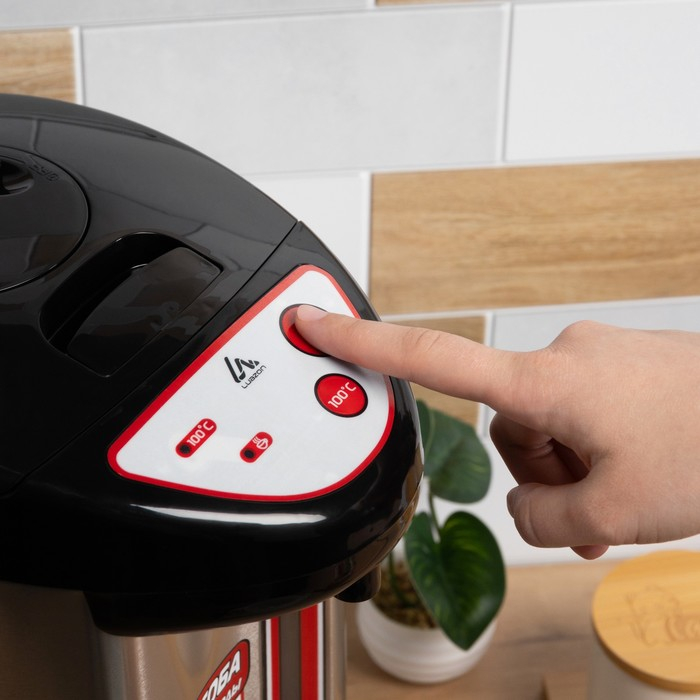 Термопот LuazON LET-4001 предназначен для кипячения воды и поддержания её температуры. Имеет 3 способа подачи воды: механическая помпа, электрическая помпа и нажатие кружкой. Оснащён индикатором уровня воды и защитой от случайного нажатия.