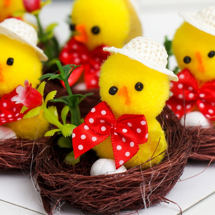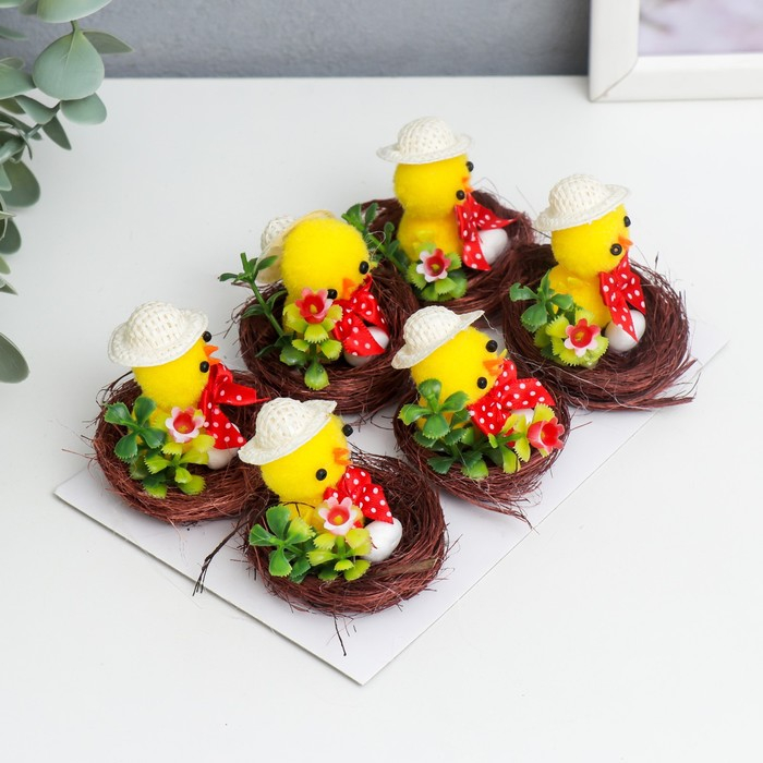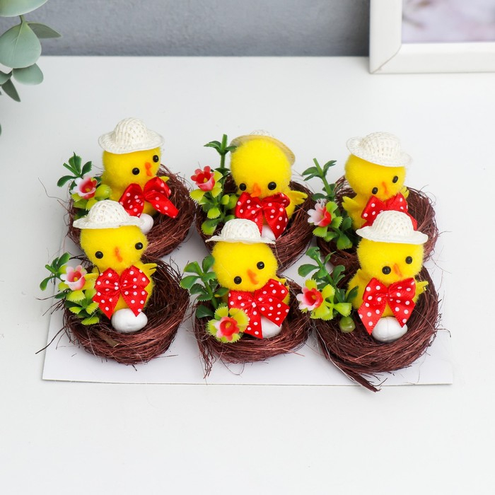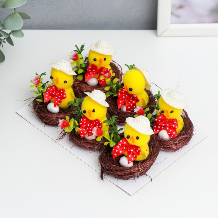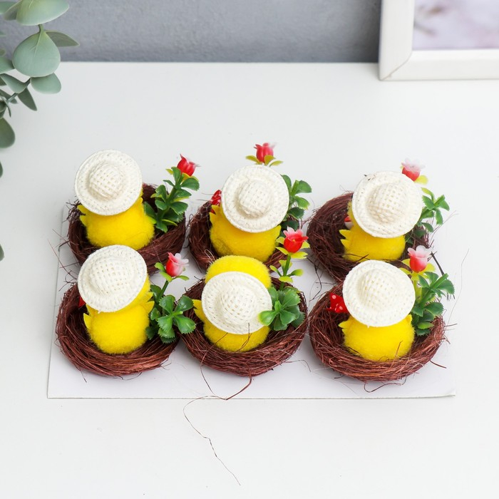 Сувенир пасхальный "Цыплёнок в шляпке в гнезде с цветком" набор 6 шт 3х4х4 см