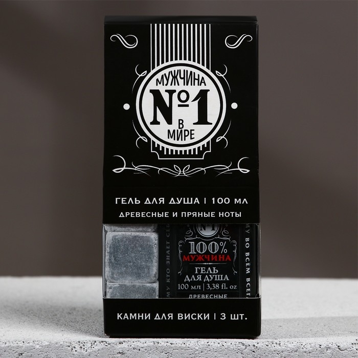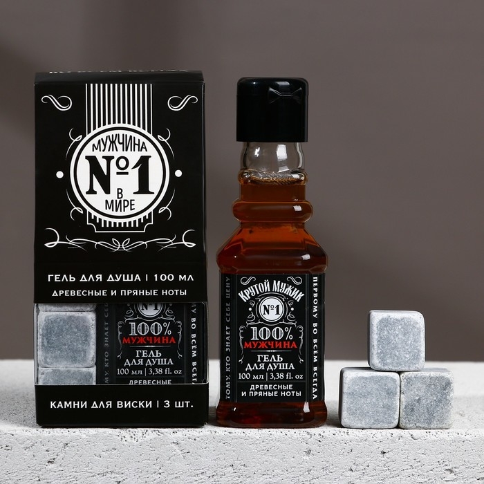 Подарочный набор косметики «Мужчина №1», гель для душа во флаконе виски 100 мл и камни для виски 3 шт, аромат древесный с пряными нотами, Новый Год