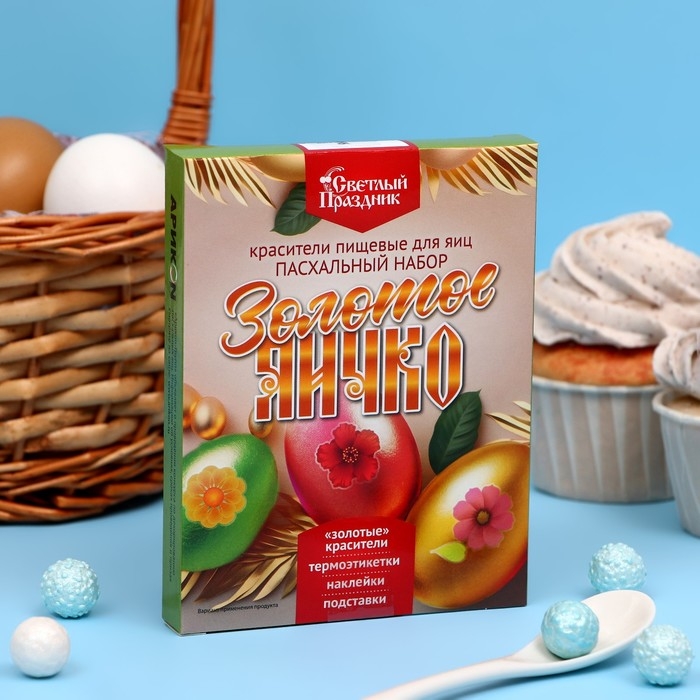 В состав пасхального набора пищевых красителей для яиц "Золотое яичко" входят термоэтикетки, наклейки, подставки и "золотые красители". На упаковке с краской Вы найдете полную инструкцию, которая научит, как правильно окрасить яйца к Пасхе. Также можно дополнить декор стразами или ручной росписью.