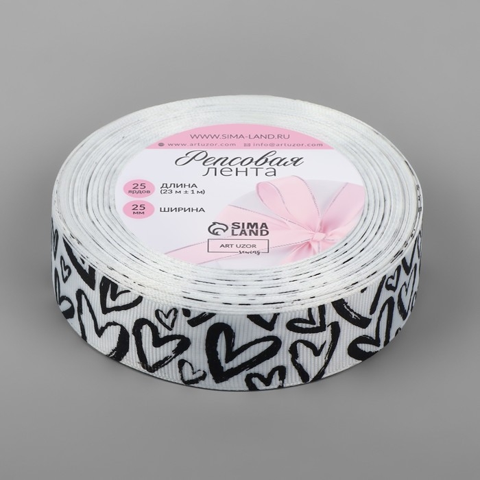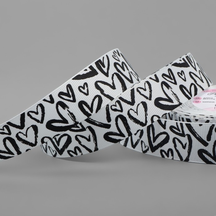 Лента репсовая «Сердца», 25 мм, 23 ± 1 м, цвет белый/чёрный