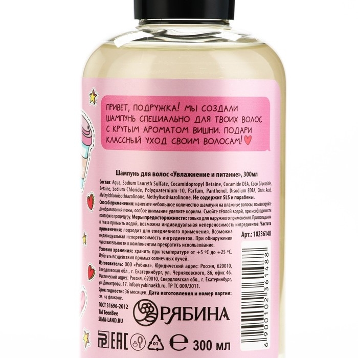 Шампунь для волос, увлажнение и питание, 300 мл, аромат вишни, TeenBee