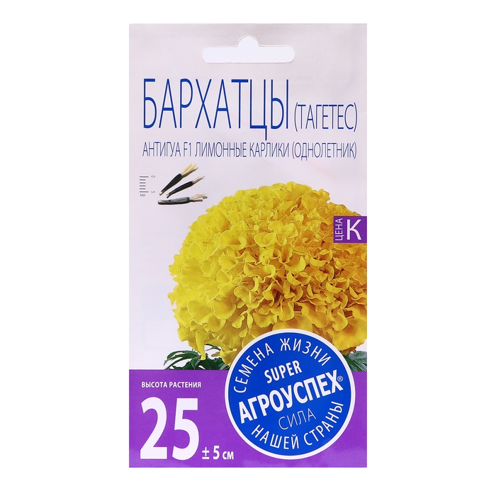 Самые величественные среди бархатцев. Компактный кустик высотой 25-30 см с крупными густомахровыми лимонными соцветиями (до 8-10 см) не оставит равнодушным любителей бархатцев. Многочис-ленные прочные цветоносы насыщенно зеленого цвета все лето до самых морозов покрыты яркими цветками. Растение наиболее устойчиво к неблагоприятным погодным условиям. Используется для цветников, бордюров, клумб. Прекрасно сочетается с сальвией и пеларгонией. Условия выращивания: посев март-апрель на рассаду, в мае возможен высев в открытый грунт в районах с теплым климатом. Рассаду высаживают после угрозы весенних заморозков. Растения, выращенные через рассаду, зацветают раньше и дольше цветут. Не требовательны к почве и влаге. Предпочитают открытые солнечные места. Чтобы продлить цветение необходимо удалять увядшие цветки.