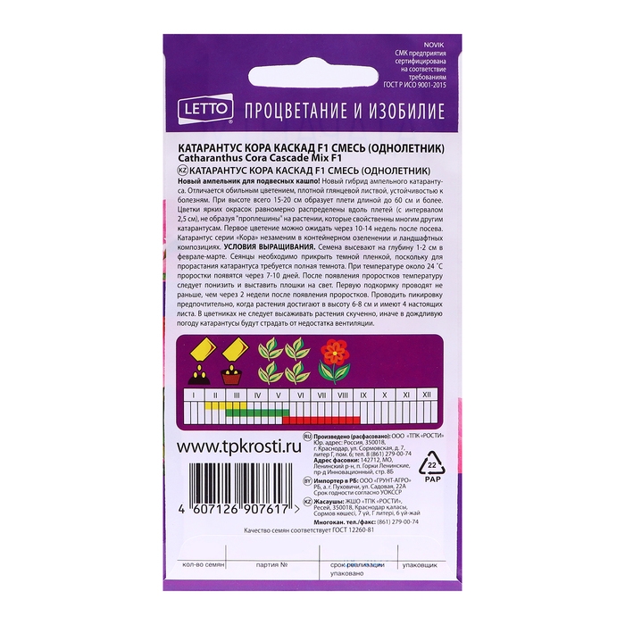 Вечнозелёное растение семейства кутровых родом из тропиков.В комнатной культуре катарантус выращивают как горшечное растение. Ветви катарантуса (высотой от 30 до 60 см) покрыты многочисленными удлинёнными листьями.Листва блестящая ,ярко зелёного цвета с белой жилкой посередине. Множественные цветки катарантуса довольно крупные -3-4см, окраска их бывает разнообразной: белой, розовой, нежно-фиолетовой,бордо,вишнёвая. Центр цветка украшает жёлтый или ярко-малиновый "глазок". Цветёт катарантус непрерывно с мая по октябрь.Зимует в прохладном светлом месте.Количество семян-5шт