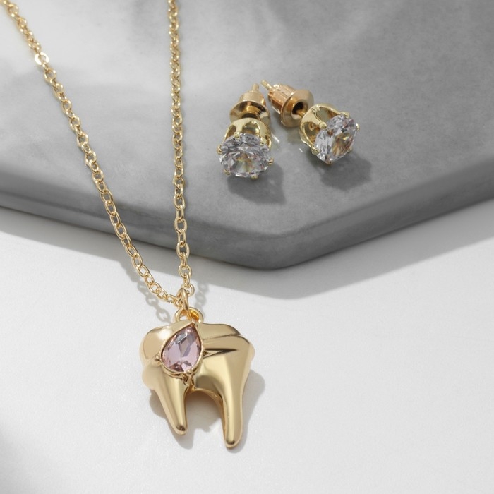 Гарнитур 2 предмета: серьги, кулон «Зуб», цвет бело-розовый в золоте, 40 см
