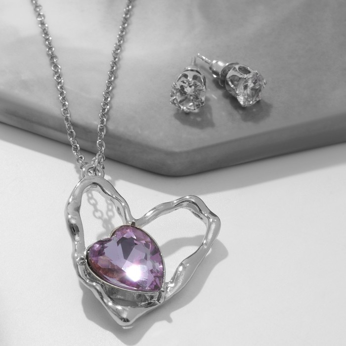 Гарнитур 2 предмета: серьги, кулон «Сердце» дуэт, цвет бело-розовый в серебре, 40 см