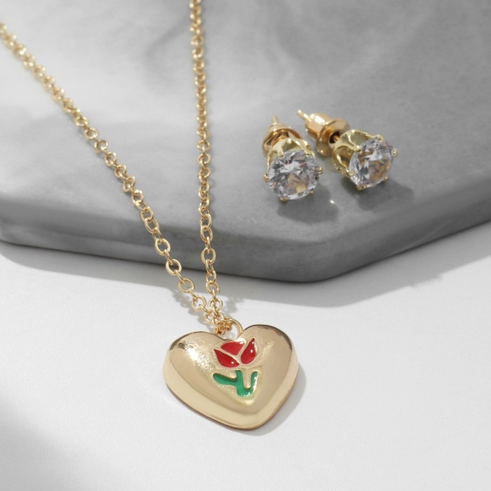 Гарнитур 2 предмета: серьги, кулон «Сердце» с цветком внутри, цветной в золоте, 40 см