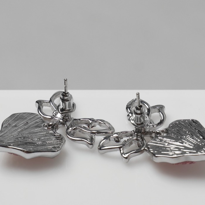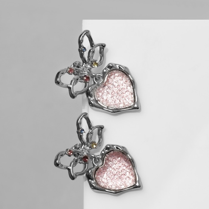 Серьги металл «Сердечки» розовая вставка, цвет серебро