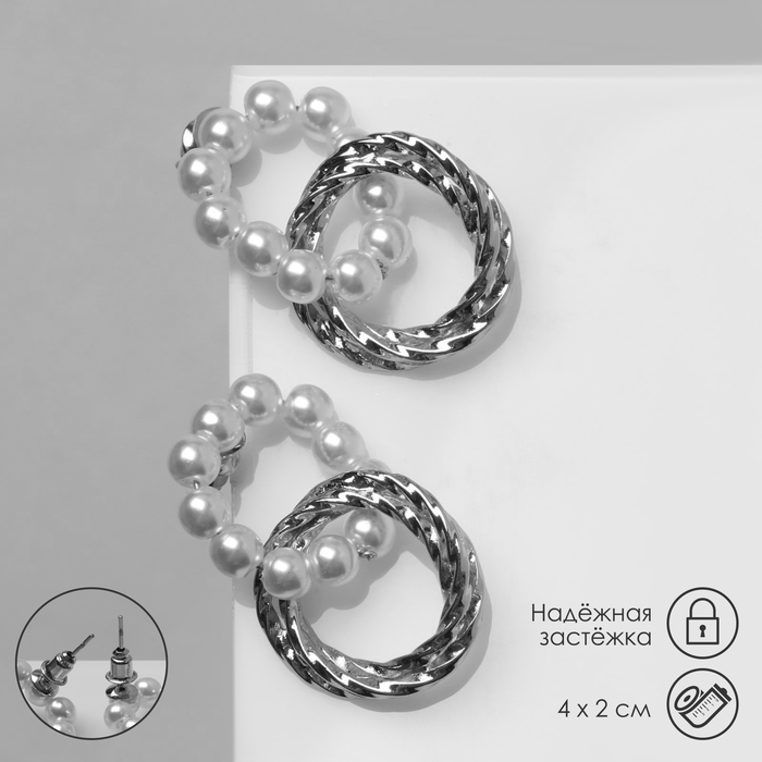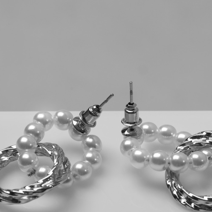 Серьги с жемчугом «Два кольца» бусины и металл, цвет серебро