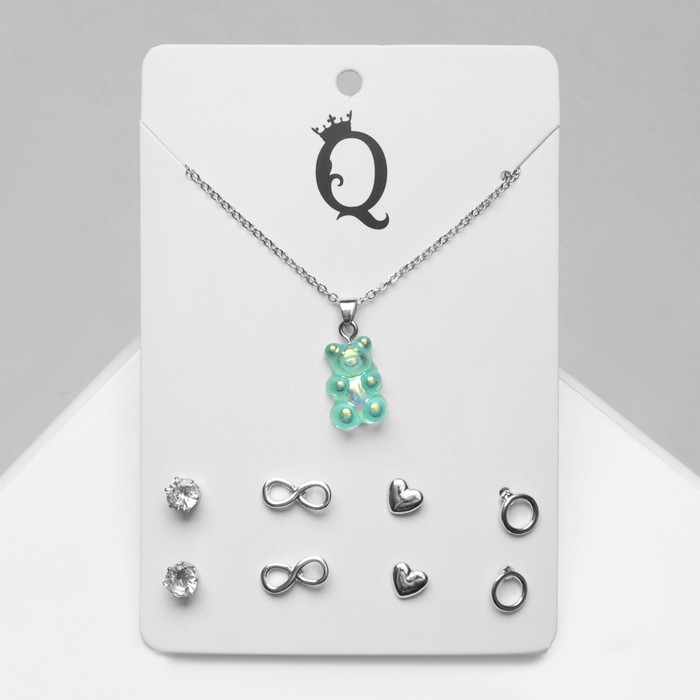 Гарнитур 5 предметов: серьги (4 пары), кулон «Мармеладный мишка», цвет тиффани в серебре, 40 см
