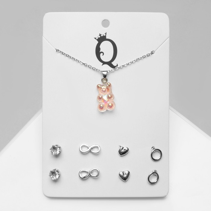 Гарнитур 5 предметов: серьги (4 пары), кулон «Мармеладный мишка», цвет розовый в серебре, 40 см