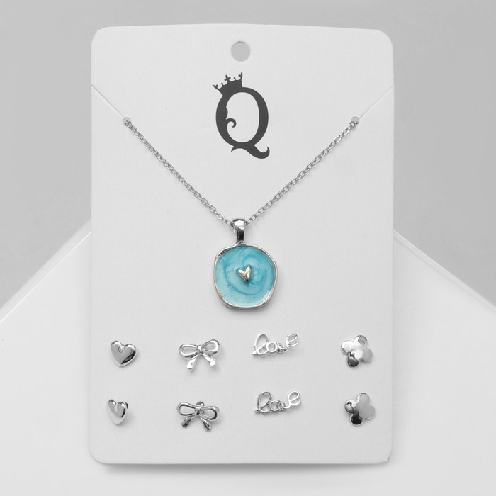Гарнитур 5 предметов: серьги (4 пары), кулон «Минимал» сердце, цвет голубой в серебре, 40 см