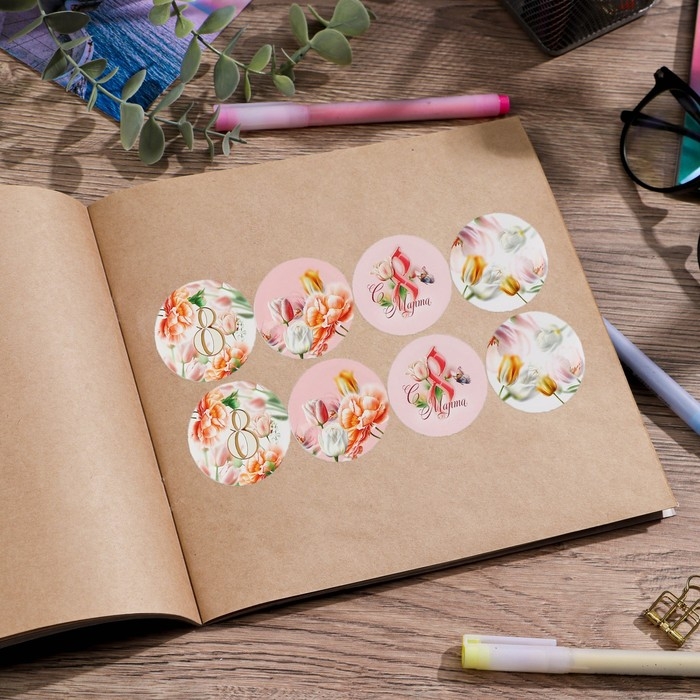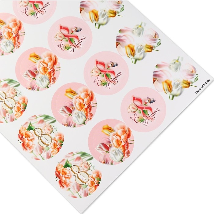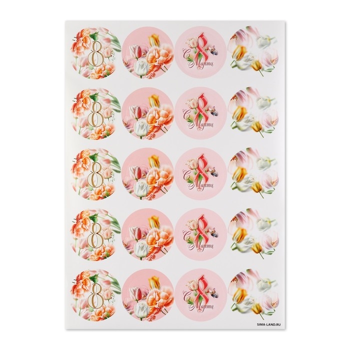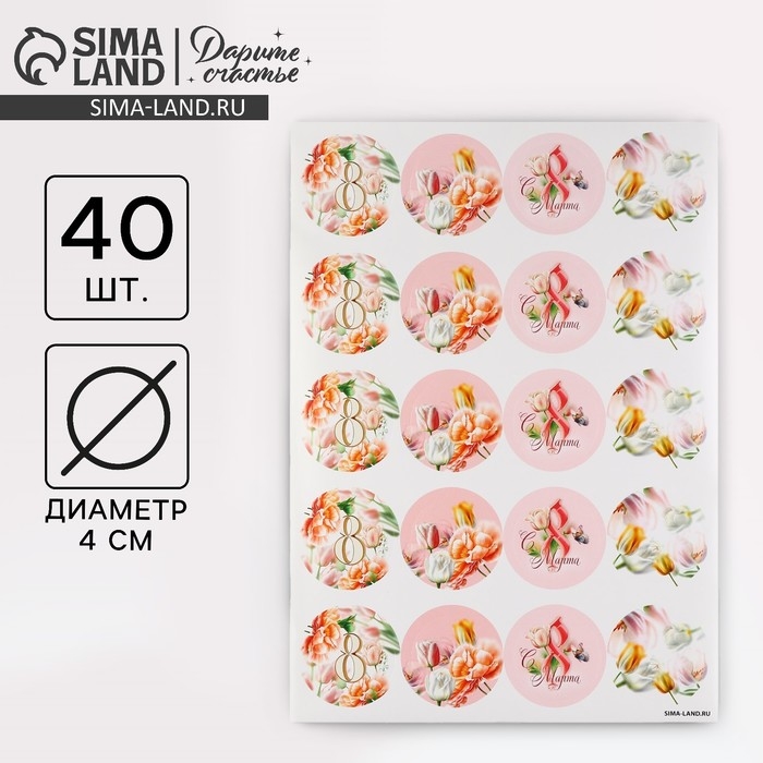 Наклейки для бизнеса и подарков и цветов, «С 8 марта», цветы, 40 шт, 4 х 4 см