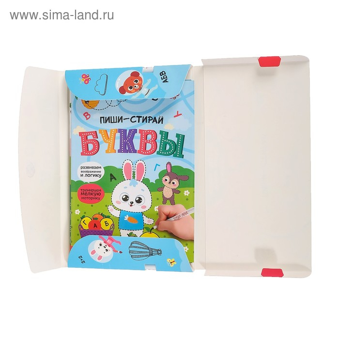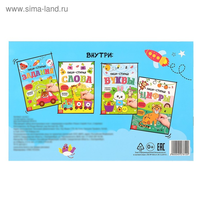 - В комплекте представлено 4 книжки разной тематики и 2 маркера пиши-стирай.