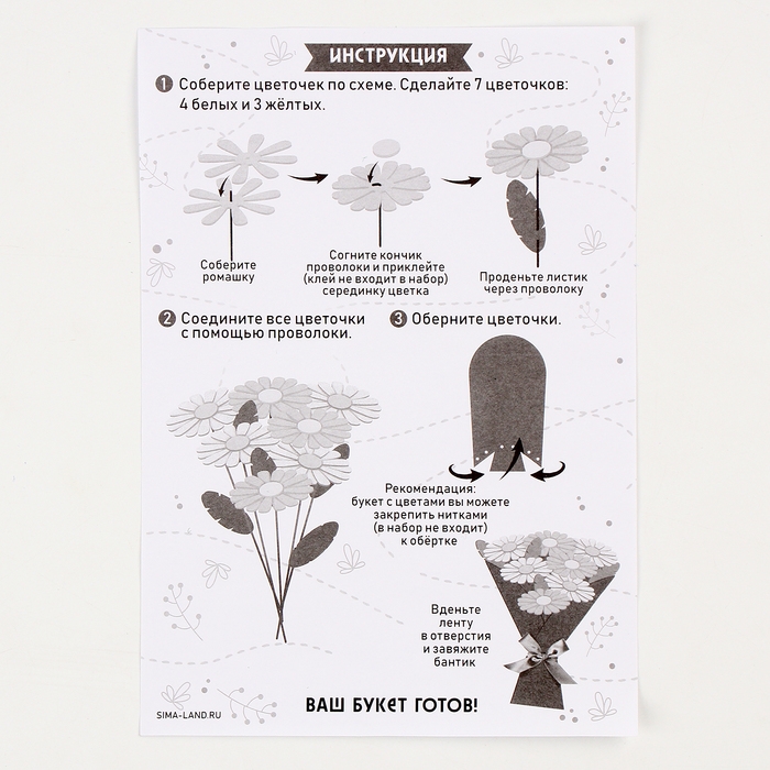В набор входят фетровые элементы,лента, проволока и инструкция. Малышу достаточно сложить уже вырезанные элементы по инструкции, вставить проволоку, а затем сформироватть цветочки и замечательный подарок готов! Открытку можно подарить близкому человеку.